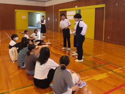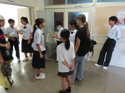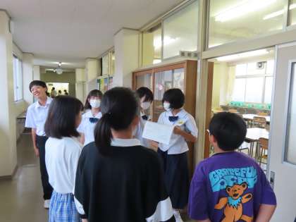 9月21日(土)1年生「小学生に校舎を案内しよう!」 公開日 2024/09/21 更新日 2024/09/22 1年生 学校公開日の今日、1年生が訪れた小学生に校舎を案内しました。 「ここで、この前、ハンバーグをつくりました」 ・・・なんて言ってたみたいですよ。 (写真上)グループごとに中学生が説明 (写真中)「ここは美術室です」 (写真下)「ここは音楽室です」