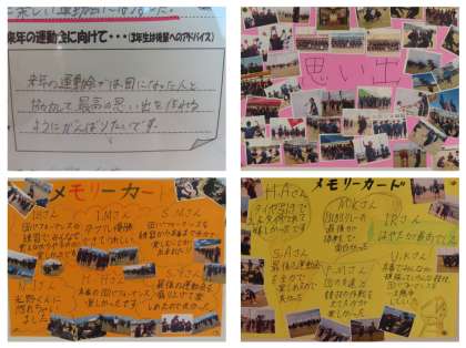それぞれの教室前には、自分の団の色の用紙に書いた振り返りが掲示されています。