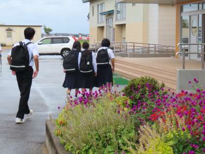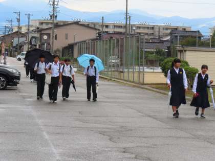 10月3日(木)「登校風景」 公開日 2024/10/03 更新日 2024/10/03 学校生活 おはようございます。 雨が降り、路面が濡れています。 先週までとはうってかわって、肌寒い朝となりました。 今日もよろしくお願いします。