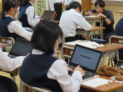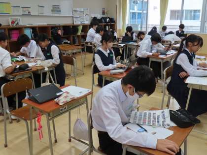 10月8日(火)2年生「授業の様子」 公開日 2024/10/08 更新日 2024/10/09 2年生 5時間目の授業は・・・ (写真上)1組社会「林業と漁業ではどんな環境保全が行われているか」 (写真中)2組家庭「ハーフパンツのポケットを丈夫に縫い付けよう」 (写真下)3組