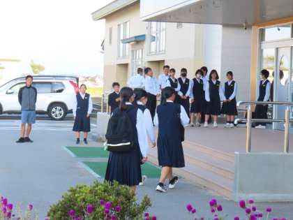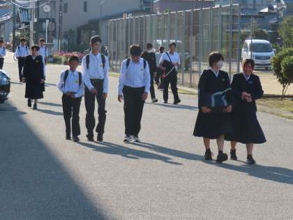 10月17日(木)「登校風景」 公開日 2024/10/17 更新日 2024/10/18 学校生活 おはようございます。 青空が気持ちのよい朝になりました。 太陽を背に生徒たちが登校してきます。 今日もよろしくお願いします。