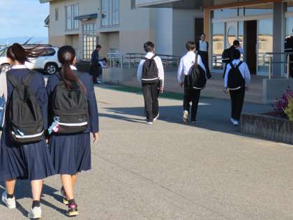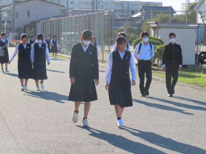 10月25日(金)「登校風景」 公開日 2024/10/25 更新日 2024/10/26 学校生活 おはようございます。 週末の今日は快晴の朝になりました。 頭の上には「下弦」の月。 今日もよろしくお願いします。
