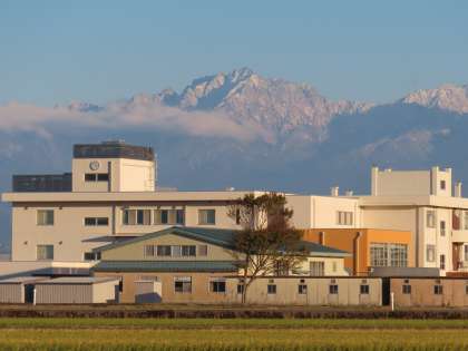 澄み渡った青空の向こう、頂に雪を抱いた立山連峰がありました。