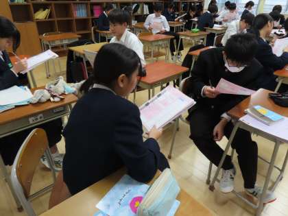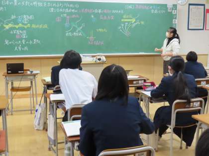 12月9日(月)2年生「授業の様子」 公開日 2024/12/09 更新日 2024/12/09 2年生 5時間目の授業は・・・ (写真上)1組音楽「ギターを弾こう」 (写真中)2組理科「日本の夏の天気の特徴をまとめよう」 (写真下)3組英語「クイズ」