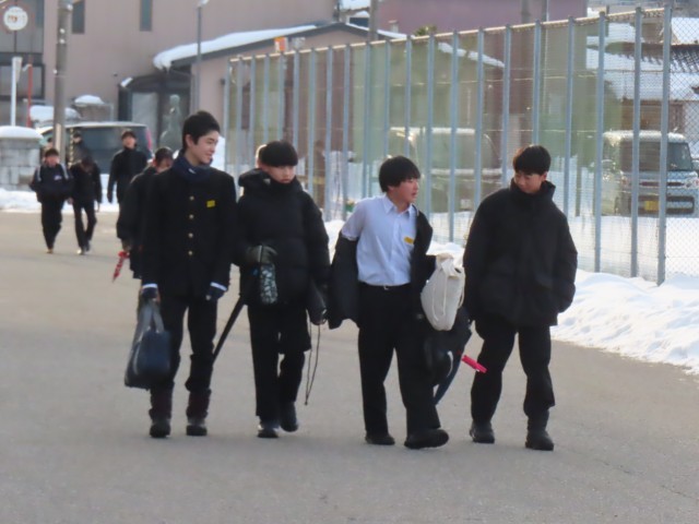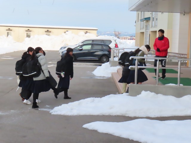 2月12日(水)「冷たい朝です」 公開日 2025/02/12 更新日 2025/02/12 学校生活 おはようございます。雲の少ない今朝は、放射冷却現象でぐっと冷え込んでいます。校門からの通路も所々凍っていました。・・・なぜか上着を脱ごうとしている生徒も。今日もよろしくお願いします。