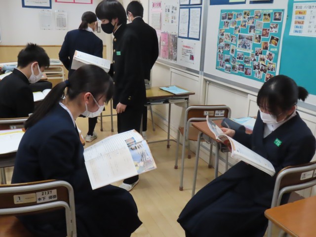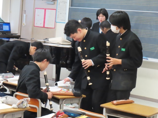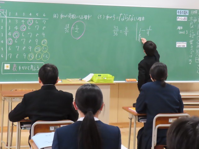 2月18日(火)2年生「授業の様子」 公開日 2025/02/18 更新日 2025/02/18 2年生 2年生の2時間目は・・・(写真上)1組英語「What serious problems does Venice have ?」(写真中)2組音楽「『きらきら星』『威風堂々』両方吹けるようになろう」(写真下)3組数学「確率を求めよう」