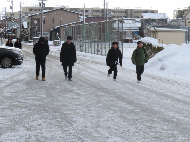 2月19日(水)「路面が凍結しています」 公開日 2025/02/19 更新日 2025/02/19 学校生活 おはようございます。今朝は、予想よりも積雪が少なかったものの、朝の冷え込みで路面が凍結していました。生徒玄関に向かう生徒たち。あわてると危ないかも・・・今日もよろしくお願いします。