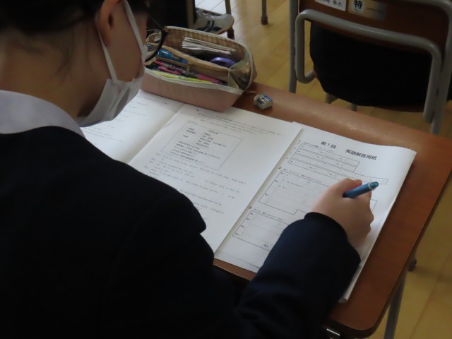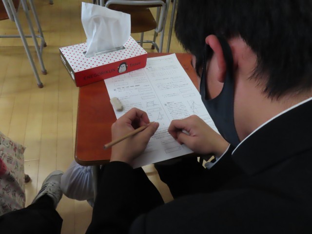 2月20日(木)3年生「授業の様子」 公開日 2025/02/20 更新日 2025/02/20 3年生 5時間目の様子です。(写真上)1組数学「総合問題」(写真中)2組家庭「まつり縫いで直せるようになろう」(写真下)3組英語「模擬テスト」