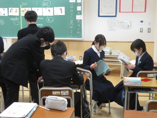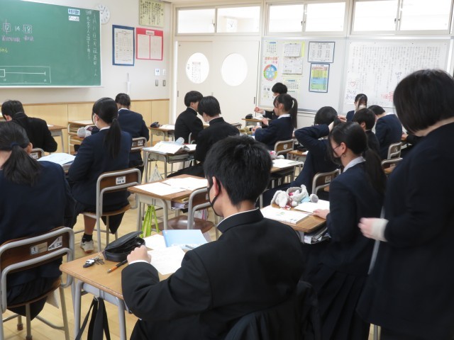 3月11日(火)2年生「授業の様子」 公開日 2025/03/11 更新日 2025/03/11 2年生 (写真上)1組英語「『A Glass of Milk』あらすじをつかもう」(写真中)2組音楽「卒業生を送る歌」(写真下)3組数学「データを整理して箱ひげ図をかこう」