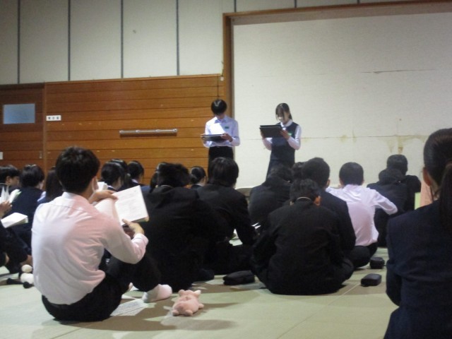 学年生徒会から修学旅行のスローガンや持ち物、ルールの説明がありました。