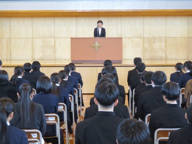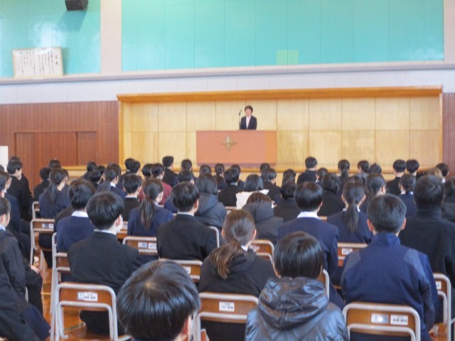 「3学期は来年度の準備の時間です。来年度、自分はどうなっていたいのか。イメージして、声に出したり、紙に書いたりするとよいですね。『生徒信条』は、いつも声に出すことでイメージすることができその姿に近付いています。3学期はあっという間です。1日1日大切にしていきましょう。そして3学期も学校生活を楽しみましょう。」