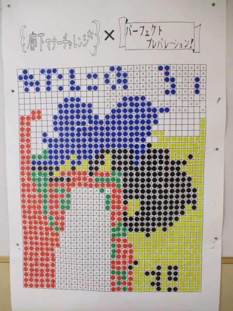 後期学年生徒会が手掛ける「廊下マナーチャレンジ」×「パーフェクトプレパレーション」の結果でつくるモザイクアートも完成が近づいてきました。上下にある文字から推測して、何が出来上がるかを予測している生徒もいるようです。ヒントは、ジ○リ作品の登場人物です。年内に完成させられるよう、さらに活動を徹底していきましょう!