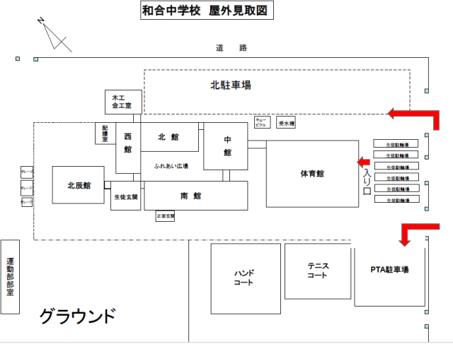 〇車は、添付の資料の「北駐車場」とテニスコート横の「PTA駐車場」に駐車してください。赤い矢印の通りにお入りください。