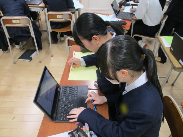 一人一人が、責任をもって調べています。調べた内容を掲示物で発表する予定なので、見やすく分かりやすい紙面にするためのアイデアや工夫について仲間と相談する姿も見られます。