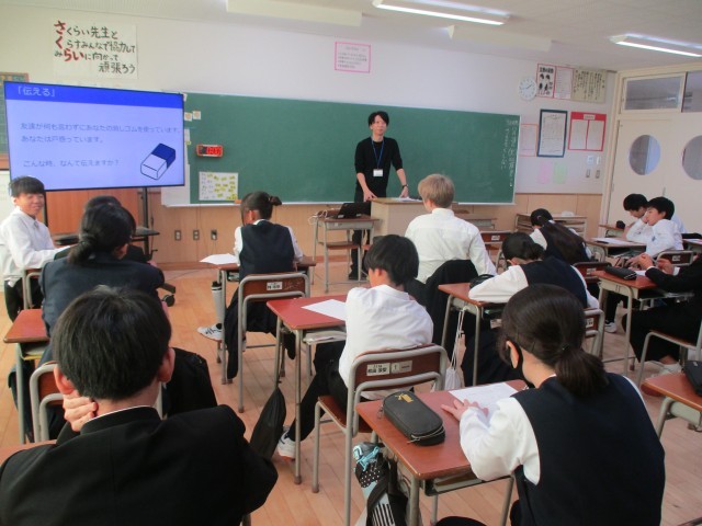 大きな行事を終えて、気持ち新たに1学年は今日も学びの道を進みます。スクールカウンセラーの徳田先生から、自分と他人の境界線についてや、気持ちの伝え方のコツについて特別講義をしていただきました。伝えたいことがあるときは、相手に伝わりやすい言葉を選ぶことが大切ですね。