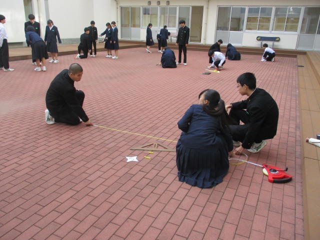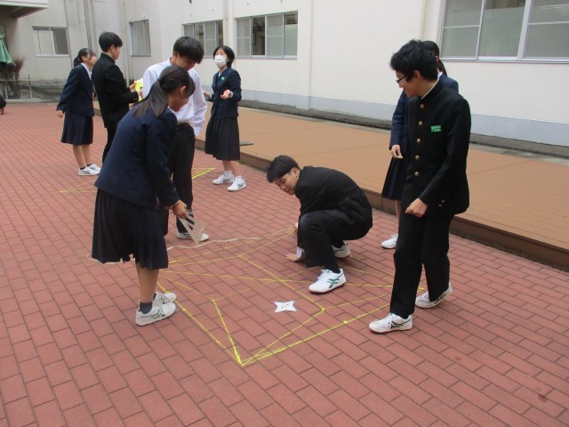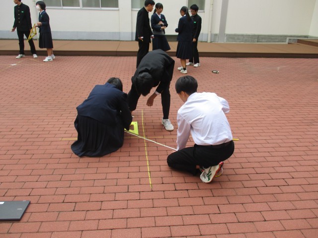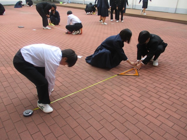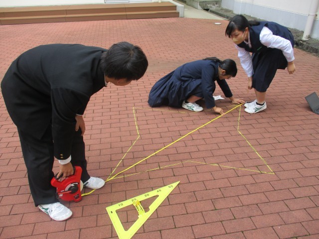 先週の3組に引き続き、今日は1組が中庭で数学の授業を行いました。
