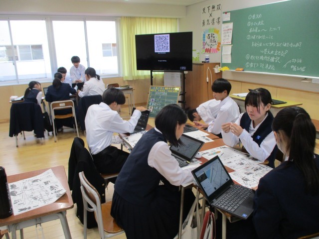 総合的な学習の時間では、八尾地区での校外学習に向けて各クラスでルートを選定していました。班員がそれぞれの学習課題を達成できるよう効率的なルートを考えています。