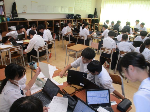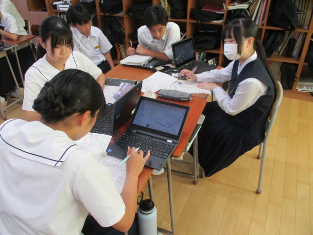 見学場所や活動場所への移動距離と必要な時間を確認しています。集合時刻に間に合うように苦心しているグループもあるようです。