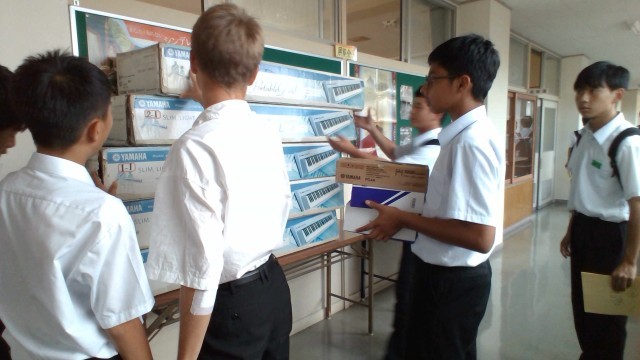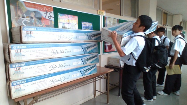 10月25日(土)の合唱コンクールに向けて、1日からいよいよ合唱練習が始まります。今日はリーダー研修会が行われました。上の2枚は、合唱とクラスを愛するリーダー達が、リーダーBOOKを配布され、担当教諭から説明・諸注意を聞いている写真です。下の4枚は、さっそく練習用のキーボード等を運んでいるところです。