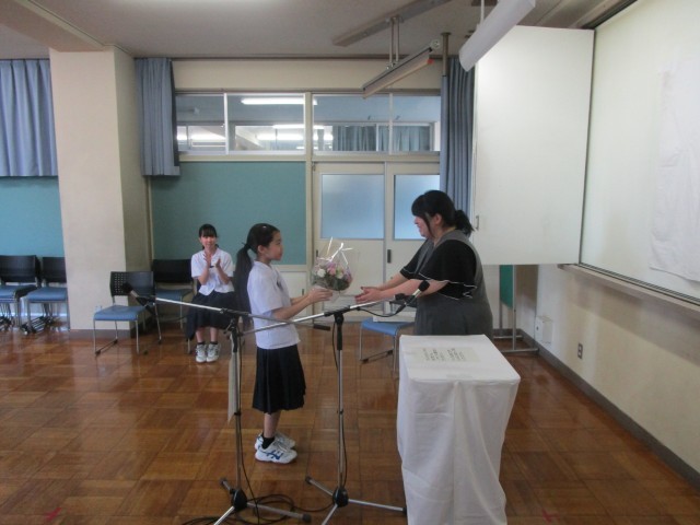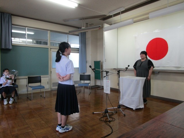 1学期で本校での勤務を終える教員の離任式を行いました。離任者から、生徒に温かいメッセージが送られました。また、生徒からは感謝の言葉と花を贈りました。今まで、ありがとうございました。