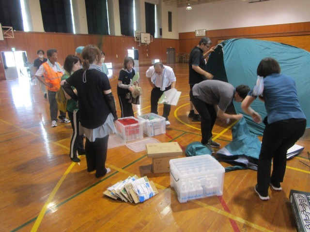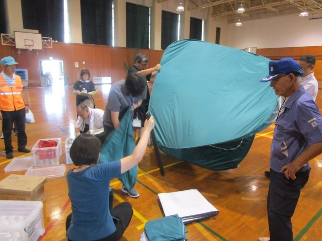 本日は、地域の自主防災担当の皆さま、富山市の職員の方、熊野地区センターの方にお越しいただき、避難所開設訓練を実施しました。備品の確認や実際にワンタッチテントを設営して、災害時を想定して訓練しました。