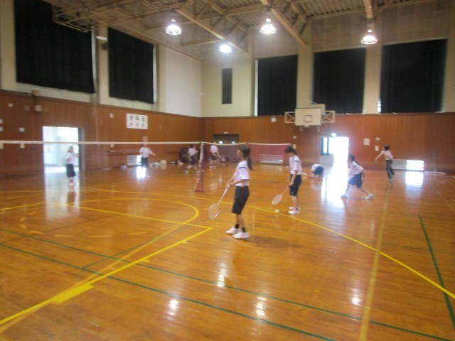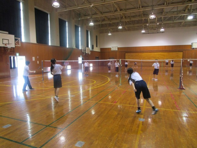 バドミントン部の活動の様子です。今日の体育館の気温は、30度を下回り、活動がしやすい状態でした。顧問と一緒に基礎打ちに取り組んでいました。