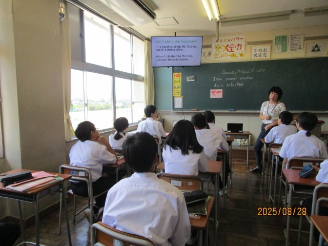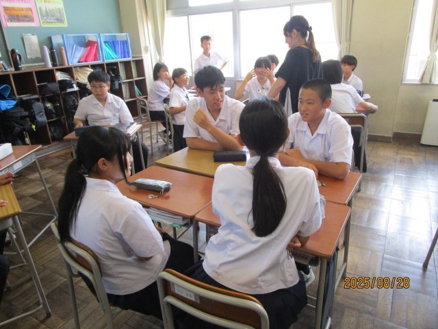 1組の体育は、バスケットボールに取り組んでいました。ゴールを狙ってシュート!暑い中でも水分補給をしながら元気に活動しました。2組の英語は、「Summer Vacation」をテーマに表現活動に取り組みました。3組の国語は、夏休みの出来事をグループでスピーチしました。