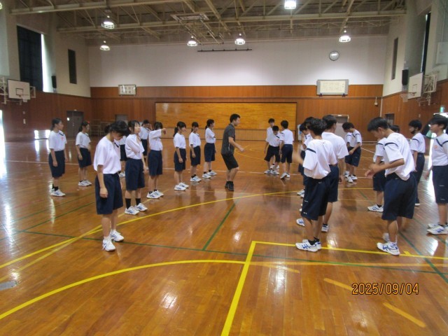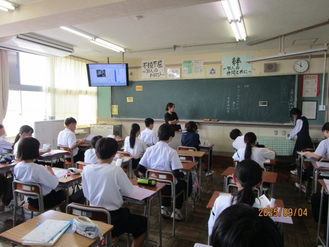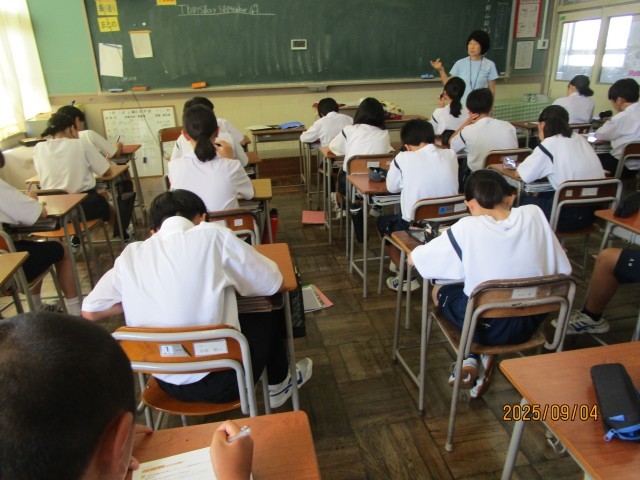 1組の体育は、ダンスの授業でした。モダンなダンスで、ステップや体をうごかしました。2組の英語は、英作文に取り組んでいました。「休日は何をしていますか?」という問いに英語で答えました。3組の国語は、米倉斉加年さんの書いた「大人になれなかっ弟たちに……」を読みました。平和教材として、昔から読み継がれているお話です。生徒は真剣に聞き入っていました。
