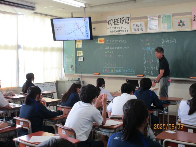 2年生の授業の様子です。1組の理科では、消化器官の仕組みについて学習しました。2組の国語は。向田邦子著「字のない葉書」という随筆について学習しました。父の愛情が分かる表現に着目して、テーマにせまりました。3組の数学では、1次関数について学習しました。学習内容は、少しずつ難しくなっていきますが、どの教科も真剣に取り組んでいます。