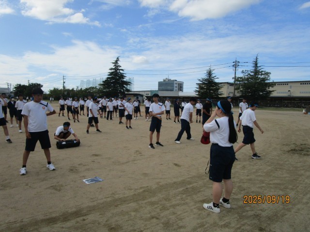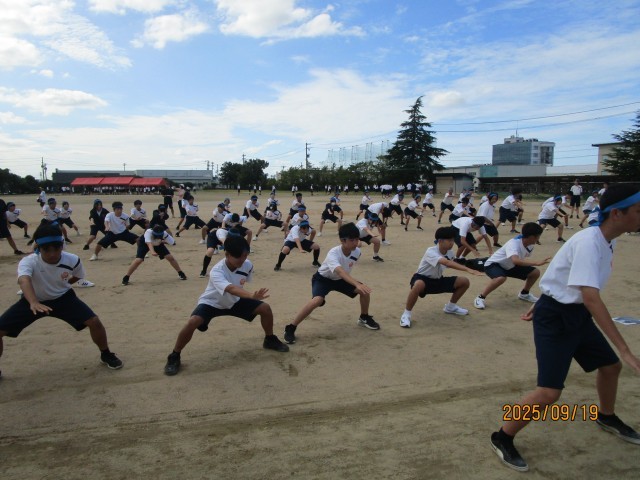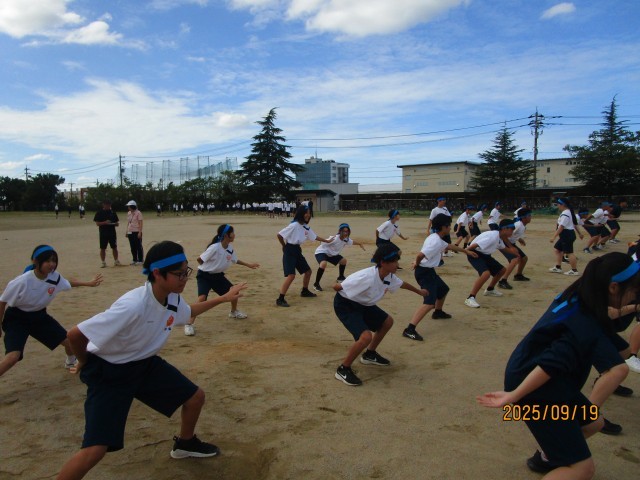 青龍団の活動の様子です。青龍団はリーダの声掛けに爽やかに活動していました。よさこいの踊りも徐々に完成に近づいています。青空に青のハチマキが映えますね。
