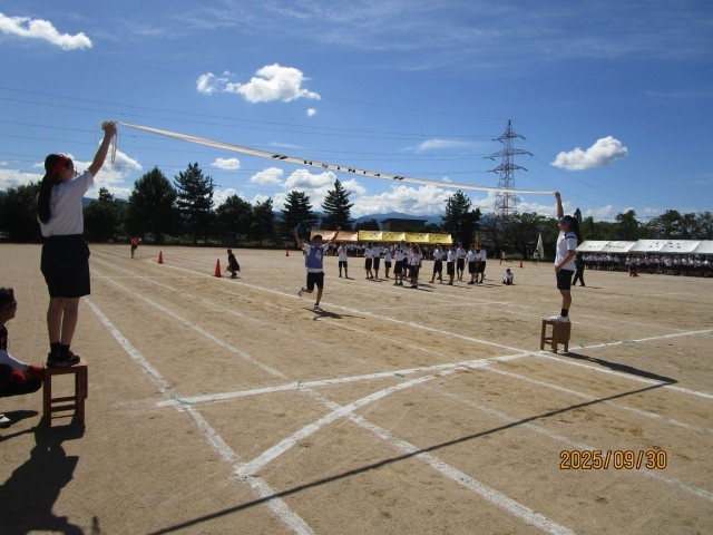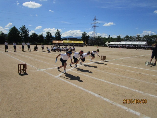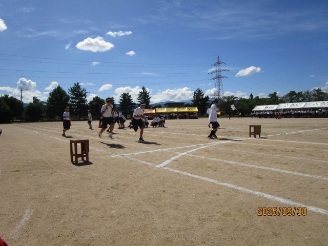 選抜リレーの様子です。各団2名の選手が選抜されバトンをつなぎました。抜きつ抜かれつの白熱した戦いでした。ゴールテープを切ったアンカー選手の清々しい顔が印象的でした。