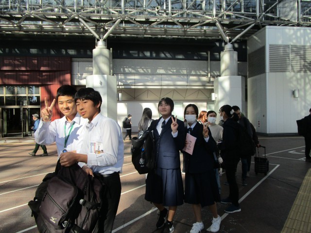 金沢駅からそれぞれの見学場所に向かいました。金沢駅のシンボル鼓門をバックにして1枚。青空がひろがり絶好の校外学習日和となりました。
