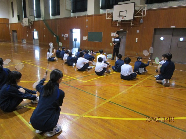 1年生の授業の様子です。1組の社会は、期末考査に向けて小テストに取り組み、これまで学習した内容を振り返っていました。2組の音楽では、鑑賞を行いました。デジタル教科書やICT機器が活用されていました。3組の体育は、バドミントンに取り組みました。ラケットの持ち方について確認しました。