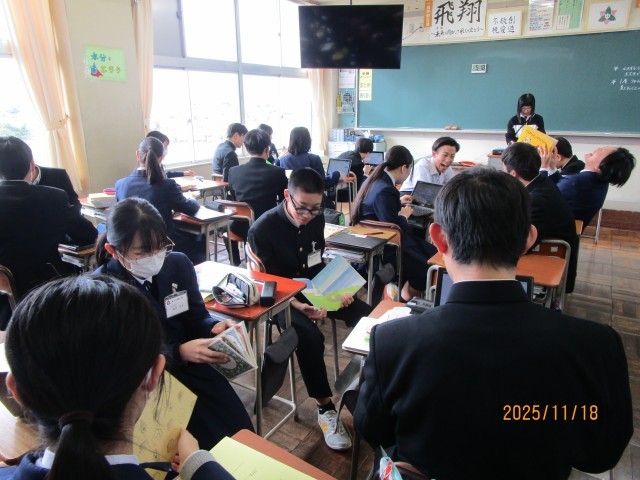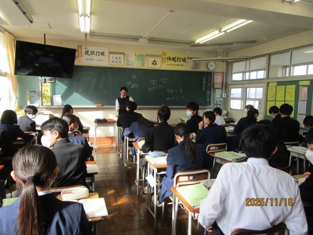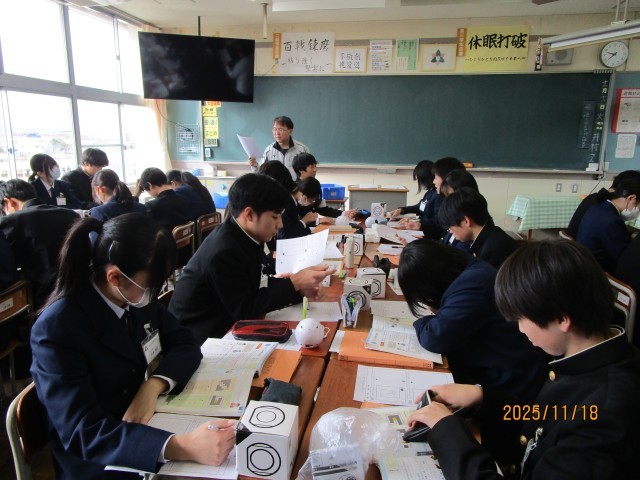 3年生の授業の様子です。1組の家庭科では、幼児へ絵本をどう読み聞かせるか考え、実際に取り組みました。2組の技術は、プログラミングについて、基礎的な事柄を学びました。3組の理科は圧力について学習しました。