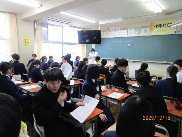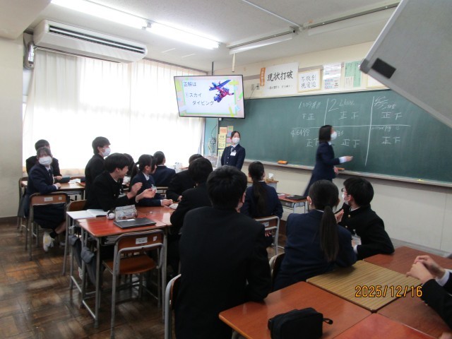 3年生の授業の様子です。1組の理科は、天体の分野について学習しました。2組の英語は、関係代名詞について長文を読みながら理解を深めました。3組の学級活動では、クラスの企画係が授業を担当する先生にインタビューしたことを基に、クイズで盛り上がっていました。3年生は、学ぶときはしっかりと学び、レクリエーションで息抜きをするなど、メリハリをつけて取り組んでいます。
