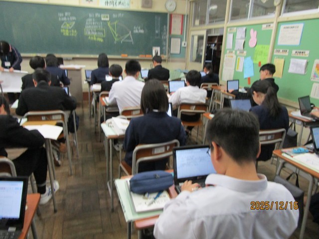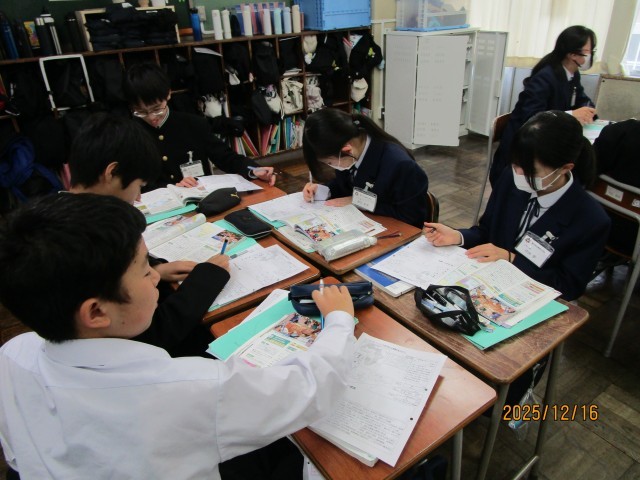 1年生の授業の様子です。1組の国語は、漢字の小テストに取り組み、基礎的な学力の定着を目指しています。2組の社会では、アフリカの地理について学習しました。3組の数学は、図形の分野を学習しました。今年の授業もあとわずかとなります。頑張れ1年生!