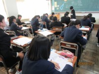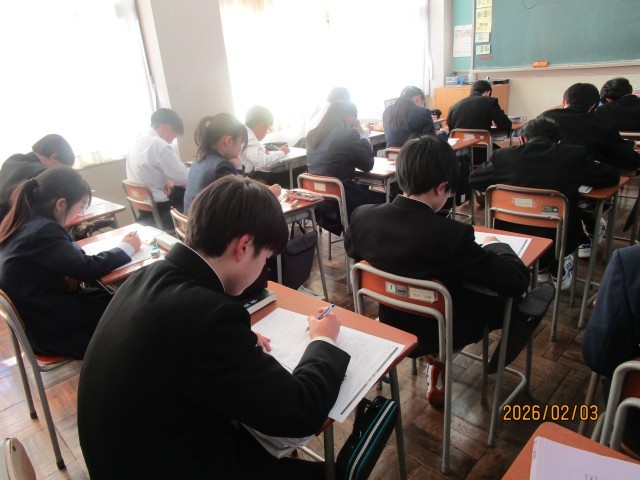 1年生授業の様子です。1組の国語では、これまで学習してきた内容を振り返る演習問題に取り組んでいました。2組の社会は、地理の分野でオセアニア州について、地図帳や資料を読み取りながら課題に取り組んでいました。3組の数学は、円柱や円錐の体積や表面積の求め方について学習しました。