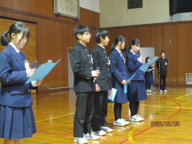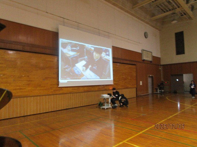 新入生説明会の様子です。1年生の生徒が、中学校生活について写真やインタビュー形式で紹介しました。工夫をこらした内容に、会場は明るい雰囲気に包まれました。発表の最後には、歓迎の思いを込めて校歌を歌いました。6年生の皆さんの心配や不安が少し和らいだのではないかと思います。みなさんの入学を心待ちにしています。