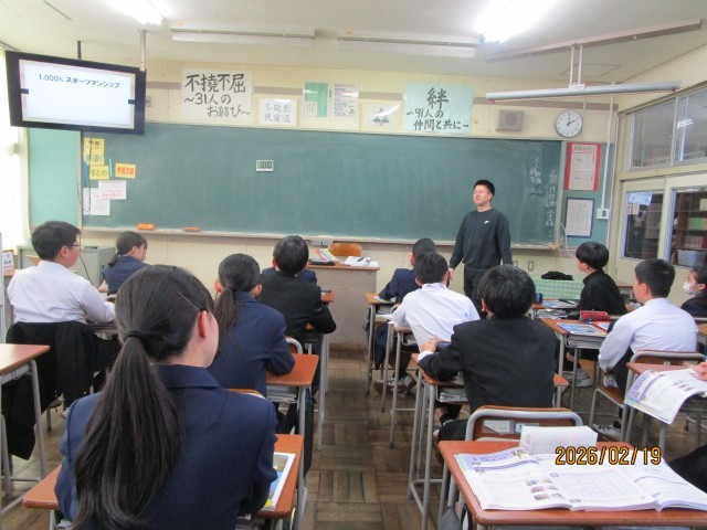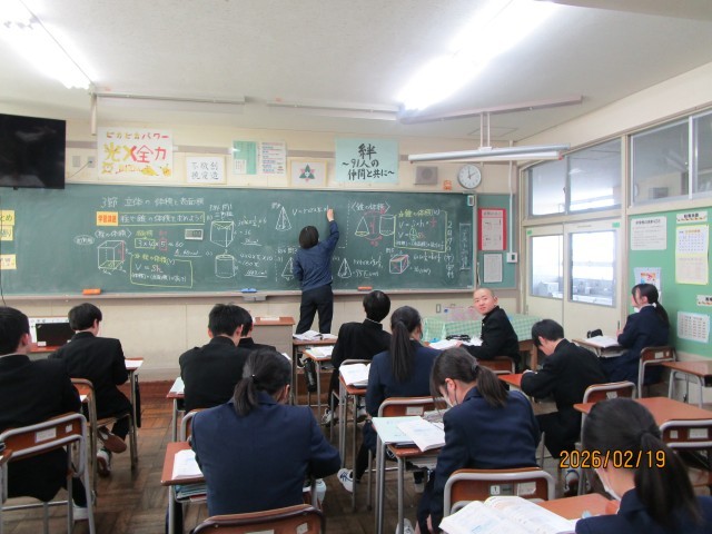 1年生授業の様子です。1組の美術は、ポップづくりを通して、いろいろな書体のレタリングを学びました。2組の数学は、三角すいの体積や表面積を計算で求めました。3組の保健では、スポーツの特性について学びました。いま、行わているミラノコルチナオリンピックでの選手たちの姿から、試合後にお互いを称え合うスポーツマンシップの素晴らしさについて考えました。