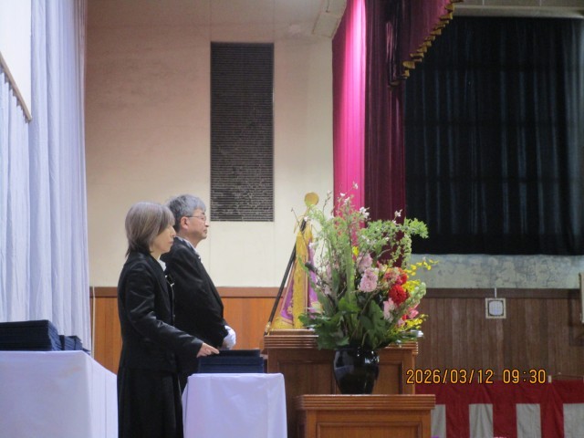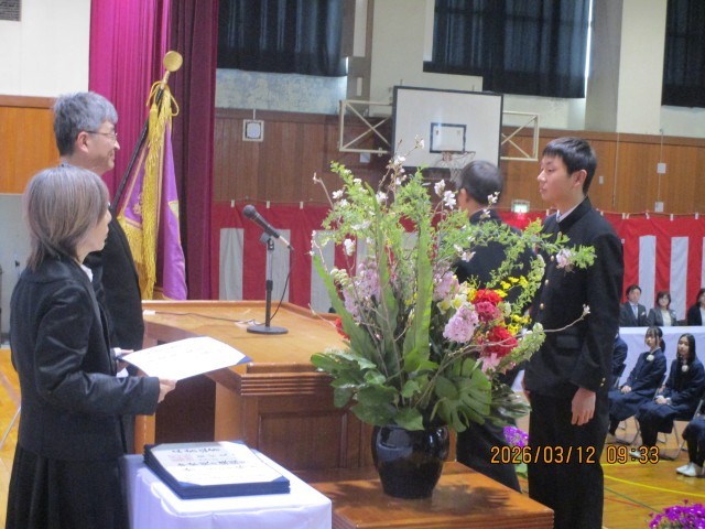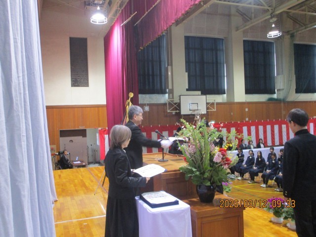 卒業証書授与の様子です。校長より手渡される証書を、両手でしっかりと受け取った卒業生たち。 その手には、義務教育を終えたという重みと、これから始まる新しい未来への希望が握られています。 緊張感の中にも、晴れやかな表情で降壇していく後ろ姿は、とても頼もしく見えました。
