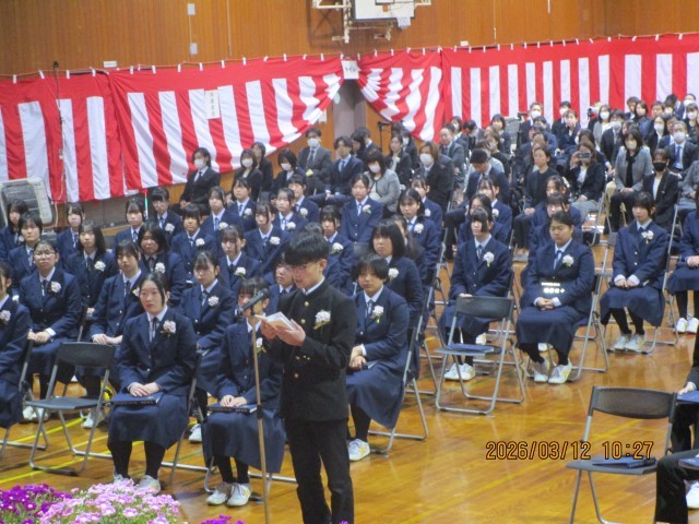 式典の終盤、卒業生代表による答辞が述べられました。 体育館が静まり返る中、一言一言を噛み締めるように語られた言葉には、3年間の重みが凝縮されていました。迷ったときに背中を押してくれた恩師への言葉。学び舎を去る寂しさとともに、教えを胸に一歩踏み出す決意が語られました。また、家族へは、照れくさくて普段は言えない本音が、素直な言葉となって届けられました。客席で見守る保護者の皆様の目にも涙が浮かび、会場全体が温かな空気に包まれた瞬間でした。最後に、行事や部活動で共に汗を流した仲間たちへ、最高の敬意と感謝が伝えられました。同じ景色を見てきた友がいたからこそ、今日という日を笑顔で迎えられたのだという確かな絆が再確認されました。