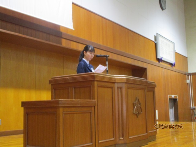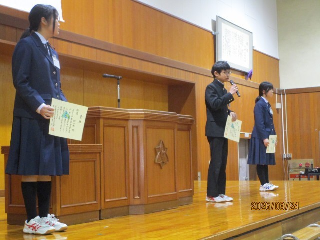 受賞報告会を行いました。「富山市小中学生書き初め大会」の結果を報告しました。その後代表生徒が、1年間を振り返って意見発表をしました。1年生の生徒は、2学期から学習の仕方を見直して成果をあげたことを話しました。2年生の生徒は、実践部長として活動することを通して責任の重さや人に伝えることの大切さについて話しました。