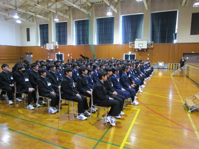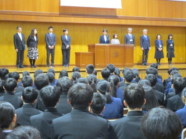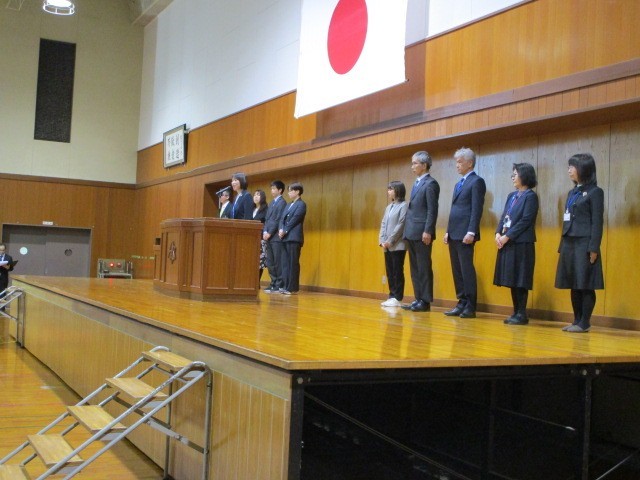 着任式を行いました。着任者が紹介されるたび、しっかりとお辞儀をして、壇上の教職員のみなさんの顔を見て話を聞いていました。