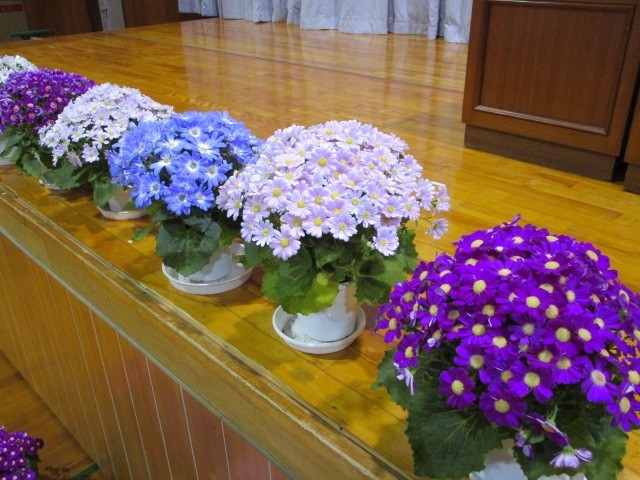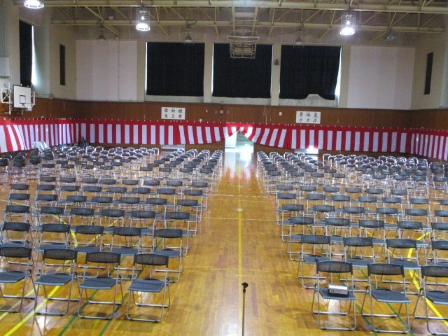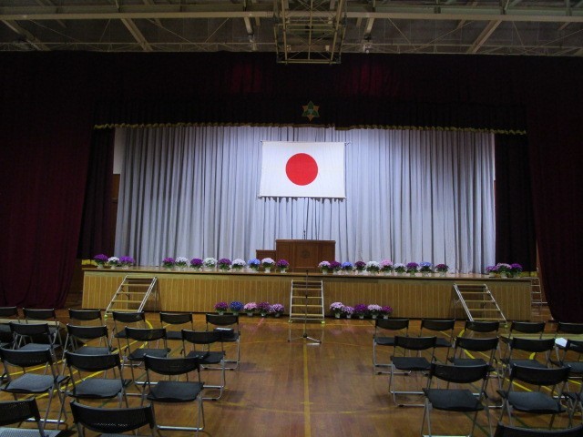 2、3年生が協力して入学式の準備を整えました。1年生教室の教科書や祝画も、会場の紅白幕やパイプ椅子、お花も準備万端です。新入生の皆さん、明日は中学校生活の新しいスタートになります。