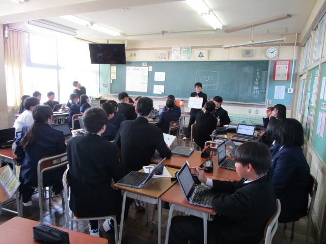 2年生は学級目標について話し合っています。それぞれの班で考えた意見をプレゼンし合うなど、活発に話し合いが行われていました。