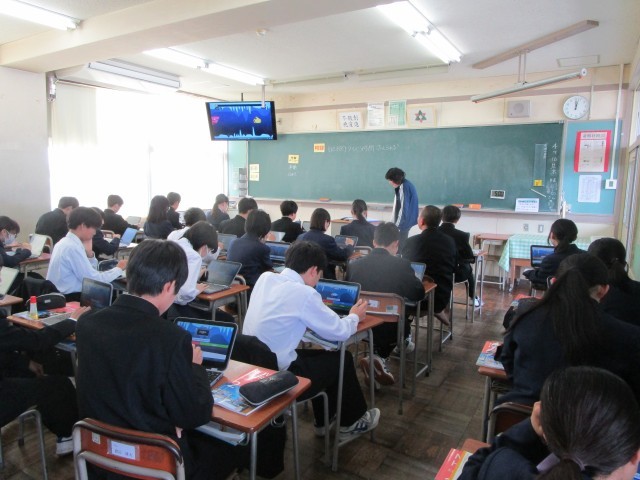 3枚目:3組英語では、アプリを使って、( )に当てはまる単語を考えています。