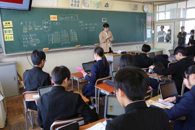 写真1枚目:1組の国語の授業では、SNSの使い方について、各班で発表資料を作成しました。