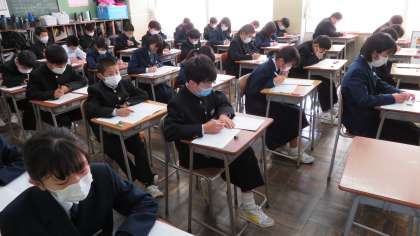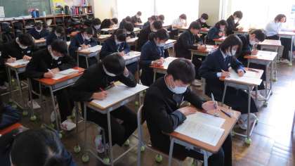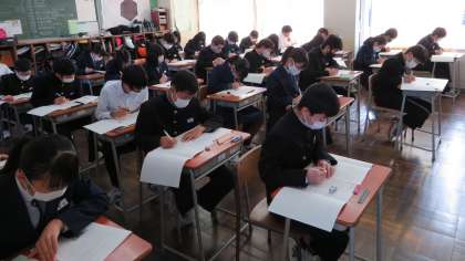 2学期末評価・2日目 公開日 2020/11/25 更新日 2020/11/25 今日の興南中 11月25日(水) 3限 「2学期末評価」2日目です。 どの生徒も真剣にテストに取り組んでいます。 (写真 上:1年2組の音楽のテストのようす) (写真 中:2年2組の美術のテストのようす) (写真 下:3年2組の保体のテストのようす)