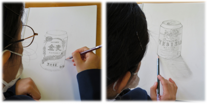 1年3組の美術は、「身近なもののスケッチ」として、各自用意した空き缶をスケッチしています。