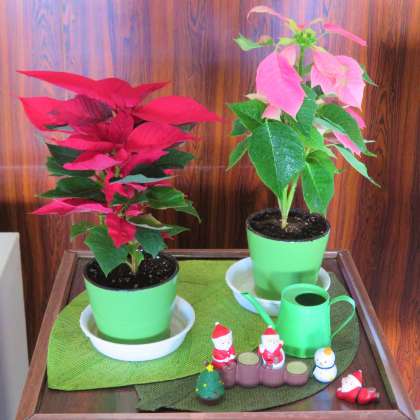 正面玄関の観葉植物を、ポトスからポインセチアに替えました。